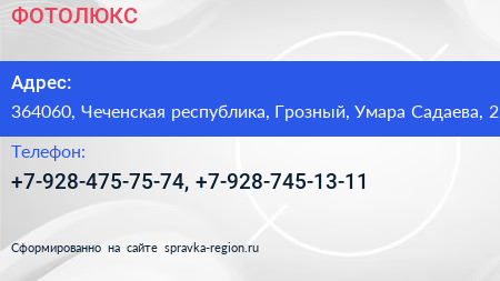 ФОТОЛЮКС по адресу 364060, Чеченская республика, Грозный, Умара Садаева, 2 в дальнейшем Организация, размещена в следующих категориях: