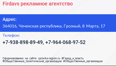 Firdavs, рекламное агентство по адресу 364016, Чеченская республика, Грозный, 8 Марта, 17 в дальнейшем Организация, размещена в следующих категориях: