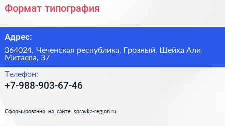 Формат, типография по адресу 364024, Чеченская республика, Грозный, Шейха Али Митаева, 37 в дальнейшем Организация, размещена в следующих категориях: