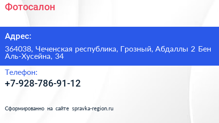 Фотосалон по адресу 364038, Чеченская республика, Грозный, Абдаллы 2 Бен Аль-Хусейна, 34 в дальнейшем Организация, размещена в следующих категориях: