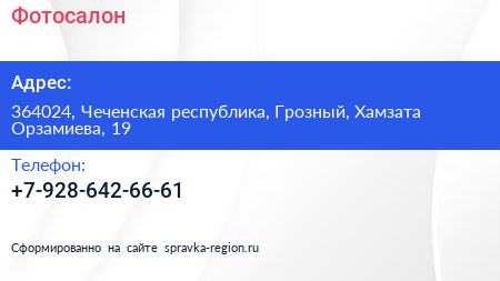 Фотосалон по адресу 364024, Чеченская республика, Грозный, Хамзата Орзамиева, 19 в дальнейшем Организация, размещена в следующих категориях: