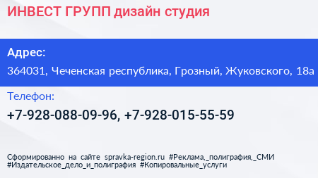ИНВЕСТ-ГРУПП, дизайн-студия по адресу 364031, Чеченская республика, Грозный, Жуковского, 18а в дальнейшем Организация, размещена в следующих категориях:
