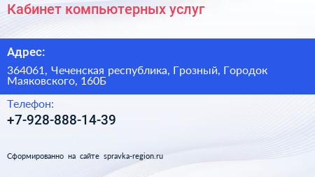 Кабинет компьютерных услуг по адресу 364061, Чеченская республика, Грозный, Городок Маяковского, 160Б в дальнейшем Организация, размещена в следующих категориях: