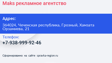 Maks, рекламное агентство по адресу 364024, Чеченская республика, Грозный, Хамзата Орзамиева, 21 в дальнейшем Организация, размещена в следующих категориях: