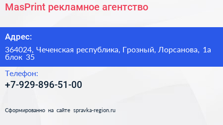 MasPrint, рекламное агентство по адресу 364024, Чеченская республика, Грозный, Лорсанова, 1а блок 35 в дальнейшем Организация, размещена в следующих категориях: