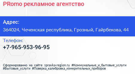 PRomo, рекламное агентство по адресу 364024, Чеченская республика, Грозный, Гайрбекова, 44 в дальнейшем Организация, размещена в следующих категориях: