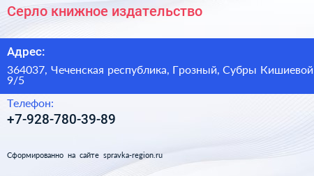 Серло, книжное издательство по адресу 364037, Чеченская республика, Грозный, Субры Кишиевой, 9/5 в дальнейшем Организация, размещена в следующих категориях: