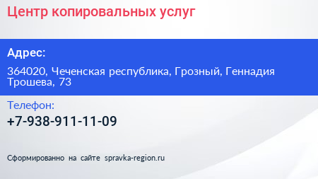 Центр копировальных услуг по адресу 364020, Чеченская республика, Грозный, Геннадия Трошева, 73 в дальнейшем Организация, размещена в следующих категориях:
