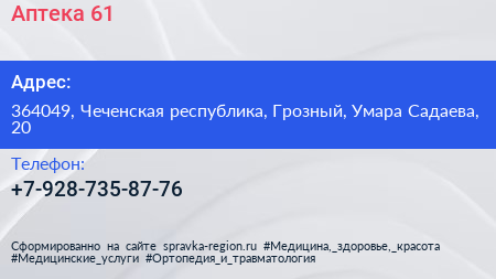 Аптека №61 по адресу 364049, Чеченская республика, Грозный, Умара Садаева, 20 в дальнейшем Организация, размещена в следующих категориях: