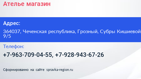 Ателье-магазин по адресу 364037, Чеченская республика, Грозный, Субры Кишиевой, 9/5 в дальнейшем Организация, размещена в следующих категориях: