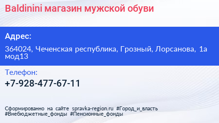 Baldinini, магазин мужской обуви по адресу 364024, Чеченская республика, Грозный, Лорсанова, 1а мод13 в дальнейшем Организация, размещена в следующих категориях: