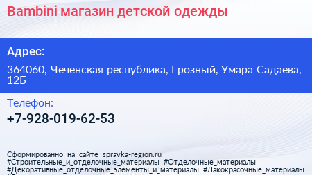 Bambini, магазин детской одежды по адресу 364060, Чеченская республика, Грозный, Умара Садаева, 12Б в дальнейшем Организация, размещена в следующих категориях: