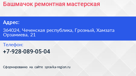 Башмачок, ремонтная мастерская по адресу 364024, Чеченская республика, Грозный, Хамзата Орзамиева, 21 в дальнейшем Организация, размещена в следующих категориях: