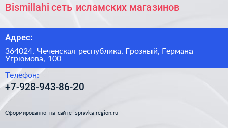 Bismillahi, сеть исламских магазинов по адресу 364024, Чеченская республика, Грозный, Германа Угрюмова, 100 в дальнейшем Организация, размещена в следующих категориях: