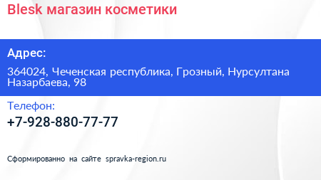 Blesk, магазин косметики по адресу 364024, Чеченская республика, Грозный, Нурсултана Назарбаева, 98 в дальнейшем Организация, размещена в следующих категориях: