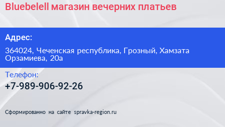 Bluebelell, магазин вечерних платьев по адресу 364024, Чеченская республика, Грозный, Хамзата Орзамиева, 20а в дальнейшем Организация, размещена в следующих категориях: