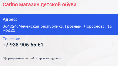 Carino, магазин детской обуви по адресу 364024, Чеченская республика, Грозный, Лорсанова, 1а мод21 в дальнейшем Организация, размещена в следующих категориях: