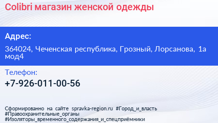Colibri, магазин женской одежды по адресу 364024, Чеченская республика, Грозный, Лорсанова, 1а мод4 в дальнейшем Организация, размещена в следующих категориях: