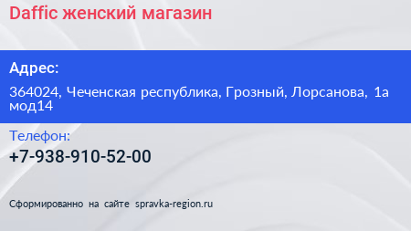 Daffic, женский магазин по адресу 364024, Чеченская республика, Грозный, Лорсанова, 1а мод14 в дальнейшем Организация, размещена в следующих категориях: