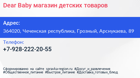 Dear Baby, магазин детских товаров по адресу 364020, Чеченская республика, Грозный, Арснукаева, 89 в дальнейшем Организация, размещена в следующих категориях: