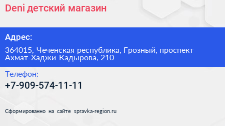 Deni, детский магазин по адресу 364015, Чеченская республика, Грозный, проспект Ахмат-Хаджи Кадырова, 210 в дальнейшем Организация, размещена в следующих категориях: