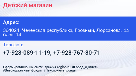 Детский магазин по адресу 364024, Чеченская республика, Грозный, Лорсанова, 1а блок 14 в дальнейшем Организация, размещена в следующих категориях: