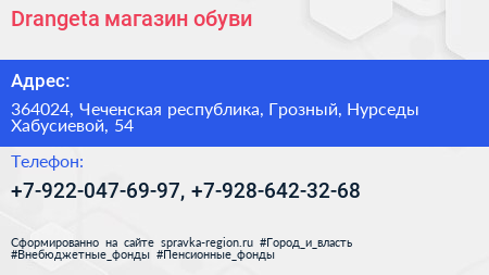 Drangeta, магазин обуви по адресу 364024, Чеченская республика, Грозный, Нурседы Хабусиевой, 54 в дальнейшем Организация, размещена в следующих категориях: