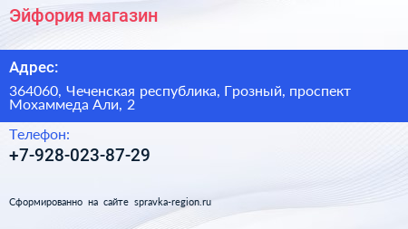 Эйфория, магазин по адресу 364060, Чеченская республика, Грозный, проспект Мохаммеда Али, 2 в дальнейшем Организация, размещена в следующих категориях: