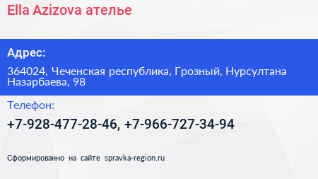 Ella Azizova, ателье по адресу 364024, Чеченская республика, Грозный, Нурсултана Назарбаева, 98 в дальнейшем Организация, размещена в следующих категориях: