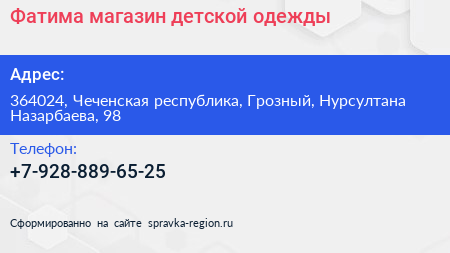 Фатима, магазин детской одежды по адресу 364024, Чеченская республика, Грозный, Нурсултана Назарбаева, 98 в дальнейшем Организация, размещена в следующих категориях: