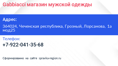 Gabbiacci, магазин мужской одежды по адресу 364024, Чеченская республика, Грозный, Лорсанова, 1а мод25 в дальнейшем Организация, размещена в следующих категориях: