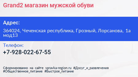 Grand2, магазин мужской обуви по адресу 364024, Чеченская республика, Грозный, Лорсанова, 1а мод13 в дальнейшем Организация, размещена в следующих категориях: