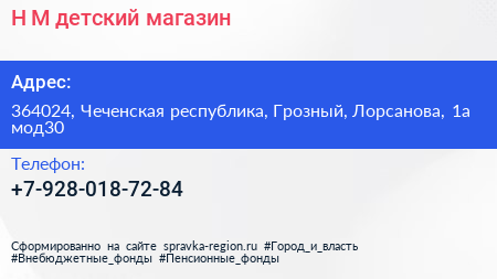 H & M, детский магазин по адресу 364024, Чеченская республика, Грозный, Лорсанова, 1а мод30 в дальнейшем Организация, размещена в следующих категориях: