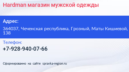 Hardman, магазин мужской одежды по адресу 364037, Чеченская республика, Грозный, Маты Кишиевой, 138 в дальнейшем Организация, размещена в следующих категориях:
