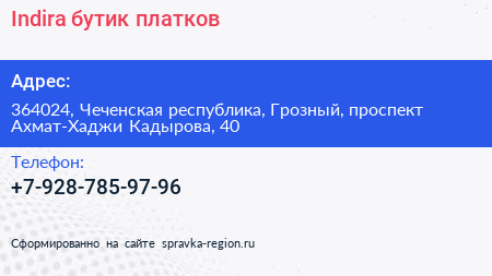 Indira, бутик платков по адресу 364024, Чеченская республика, Грозный, проспект Ахмат-Хаджи Кадырова, 40 в дальнейшем Организация, размещена в следующих категориях: