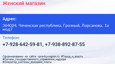 Женский магазин по адресу 364024, Чеченская республика, Грозный, Лорсанова, 1а мод7 в дальнейшем Организация, размещена в следующих категориях: