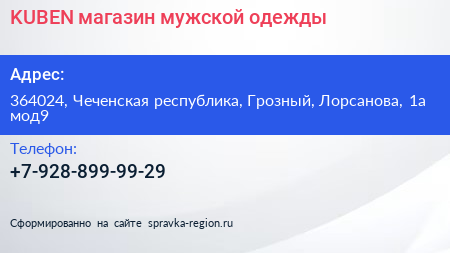 KUBEN, магазин мужской одежды по адресу 364024, Чеченская республика, Грозный, Лорсанова, 1а мод9 в дальнейшем Организация, размещена в следующих категориях: