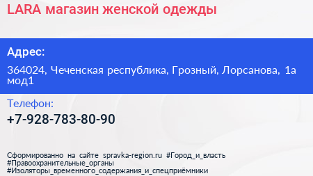 LARA, магазин женской одежды по адресу 364024, Чеченская республика, Грозный, Лорсанова, 1а мод1 в дальнейшем Организация, размещена в следующих категориях: