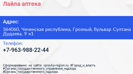 Лайла, аптека по адресу 364060, Чеченская республика, Грозный, бульвар Султана Дудаева, 9 к1 в дальнейшем Организация, размещена в следующих категориях: