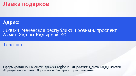 Лавка подарков по адресу 364024, Чеченская республика, Грозный, проспект Ахмат-Хаджи Кадырова, 40 в дальнейшем Организация, размещена в следующих категориях: