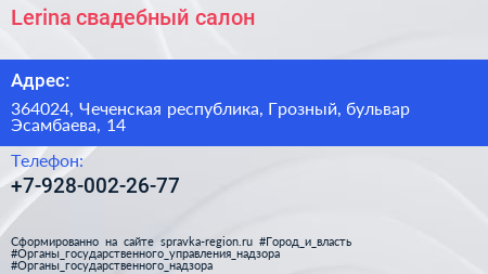 Lerina, свадебный салон по адресу 364024, Чеченская республика, Грозный, бульвар Эсамбаева, 14 в дальнейшем Организация, размещена в следующих категориях: