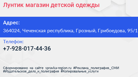 Лунтик, магазин детской одежды по адресу 364024, Чеченская республика, Грозный, Грибоедова, 95/1 в дальнейшем Организация, размещена в следующих категориях:
