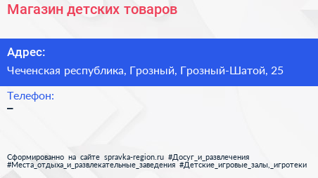 Магазин детских товаров по адресу Чеченская республика, Грозный, Грозный-Шатой, 25 в дальнейшем Организация, размещена в следующих категориях: