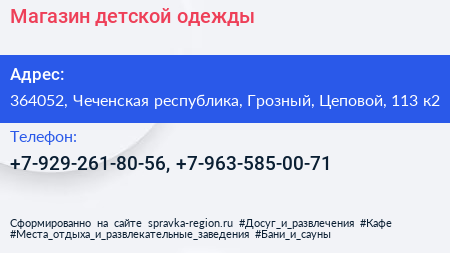 Магазин детской одежды по адресу 364052, Чеченская республика, Грозный, Цеповой, 113 к2 в дальнейшем Организация, размещена в следующих категориях: