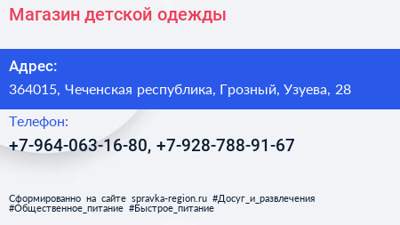 Магазин детской одежды по адресу 364015, Чеченская республика, Грозный, Узуева, 28 в дальнейшем Организация, размещена в следующих категориях: