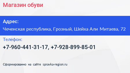 Магазин обуви по адресу Чеченская республика, Грозный, Шейха Али Митаева, 72 в дальнейшем Организация, размещена в следующих категориях: