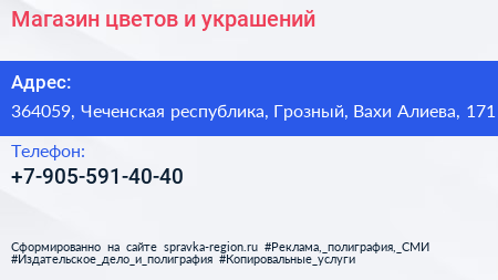 Магазин цветов и украшений по адресу 364059, Чеченская республика, Грозный, Вахи Алиева, 171 в дальнейшем Организация, размещена в следующих категориях: