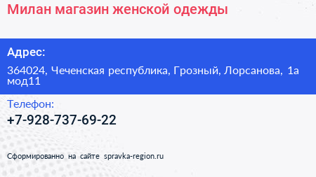 Милан, магазин женской одежды по адресу 364024, Чеченская республика, Грозный, Лорсанова, 1а мод11 в дальнейшем Организация, размещена в следующих категориях: