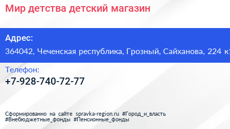 Мир детства, детский магазин по адресу 364042, Чеченская республика, Грозный, Сайханова, 224 к1 в дальнейшем Организация, размещена в следующих категориях: