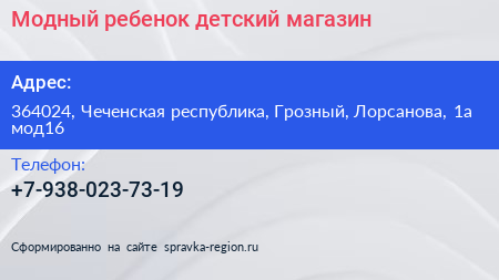 Модный ребенок, детский магазин по адресу 364024, Чеченская республика, Грозный, Лорсанова, 1а мод16 в дальнейшем Организация, размещена в следующих категориях: